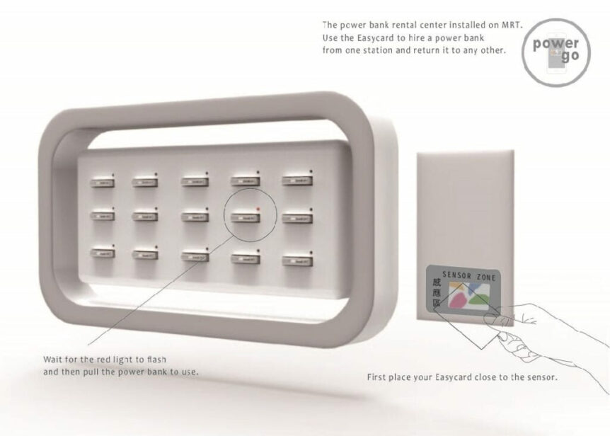 設計理念: 外出時手機沒電,相信大家都有過這樣的困擾,我們為此設計了行動電源租借站,租借站將安裝於捷運站的外票亭處,使用像Ubike的租借系統。 行動電源本身附有通用各型號的充電線,電量有2000MAH,能將手機充電至少80%電量。行動電源磁充系統的設計,不擔心有心人士拿取。使用完畢後,可在安裝有租借站的捷運站歸還,放入空缺位置,感應悠遊卡即恢復充電。
