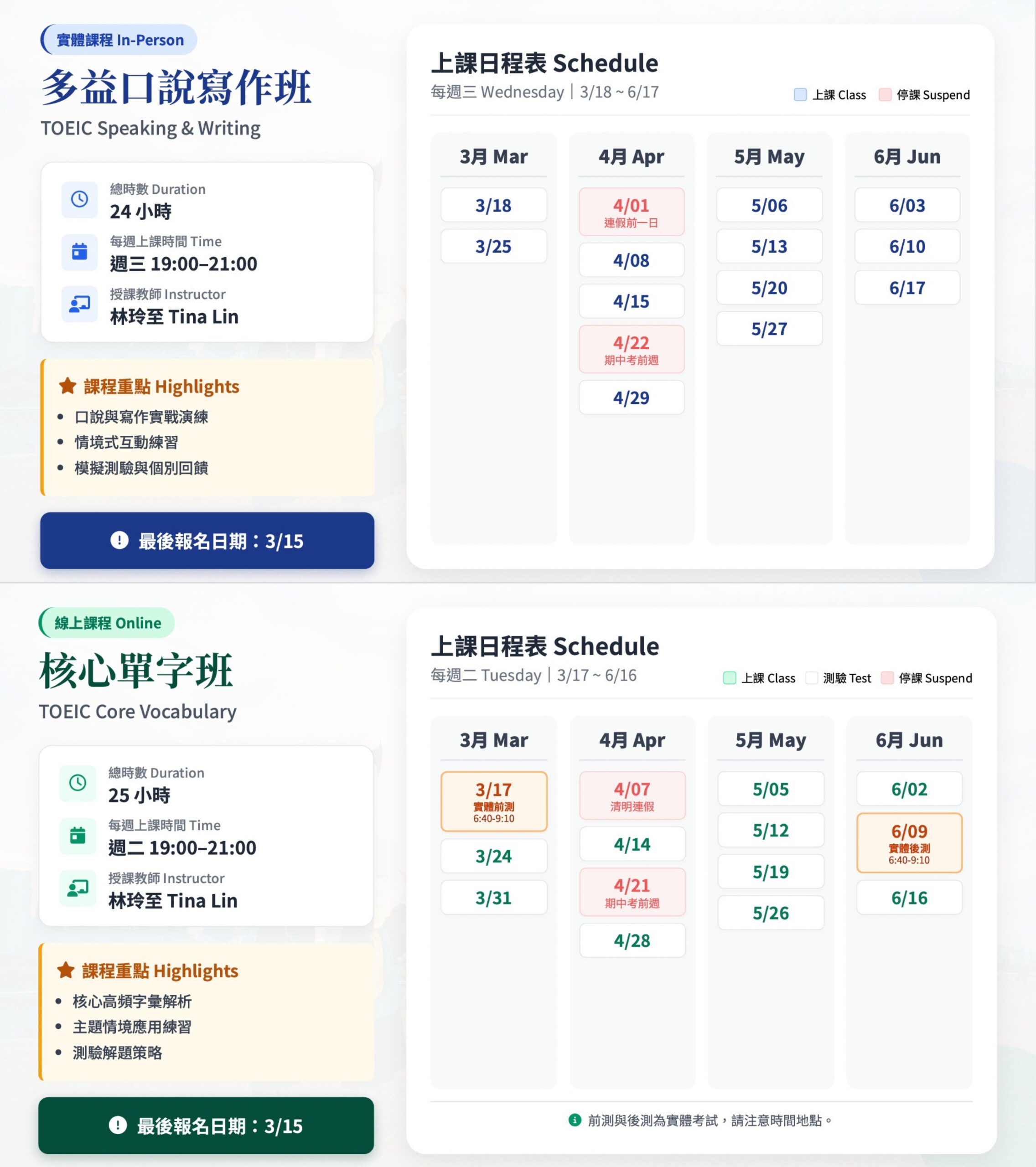EMI資源中心本學期將開設「多益口說寫作班」以及「核心單字班」兩門多益TOEIC英檢課程,報名表單連結如下,相關問題,請洽EMI資源中心。